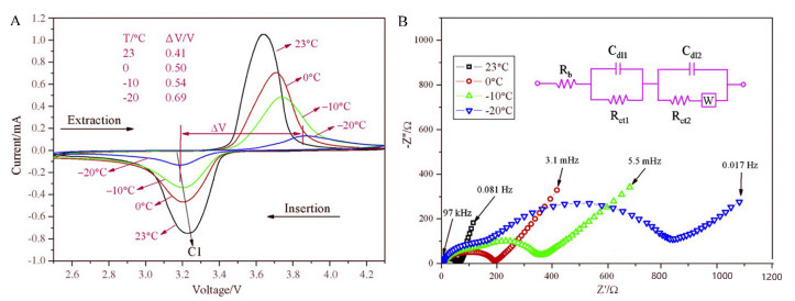 Figure 1 CV (A) and EIS (B) curves of LFP/C at different temperatures