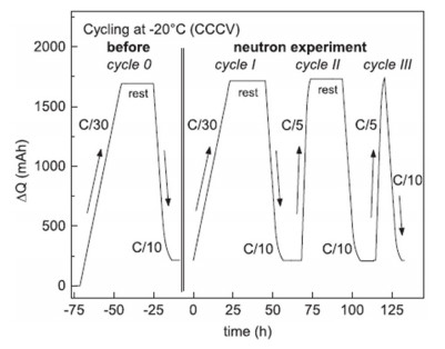Zinth et al. employed techniques such as neutron diffraction to conduct a detailed study on the lithium plating behavior of NMC111/graphite 18650-type lithium-ion batteries at a low temperature of -20°C. The batteries were charged and discharged following the process illustrated in Figure 2. Figure 3 presents a comparison of the phase changes in the graphite anode when charged at rates of C/30 and C/5, respectively.