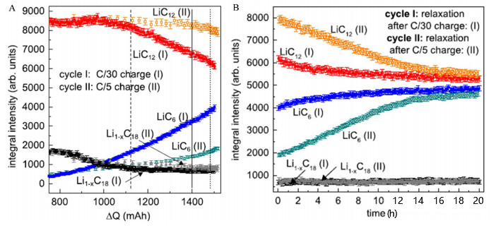 Figure 3 Comparison of phase changes in the anode after charging at different rates (A) and after standing for 20 hours (B)